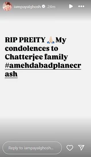 उन्होंने अपनी इंस्टाग्राम स्टोरी पर लिखा, "RIP प्रीति। चटर्जी परिवार के प्रति मेरी संवेदनाएं। #ahmedabadplanecrash।" प्रीति के बारे में बात करते हुए पायल ने कहा, "मुझे पता था कि वह लंदन जा रही थी, और जैसे ही मैंने यह खबर सुनी, मैंने तुरंत उसके परिवार से बात की। दुर्भाग्य से, उनकी चुप्पी ने ही सब कुछ बता दिया। मैं सदमे में हूं। वह मेरे कॉलेज के दिनों से मेरी दोस्त रही है, और मुझे यकीन ही नहीं हो रहा है कि वह अब नहीं रही।"