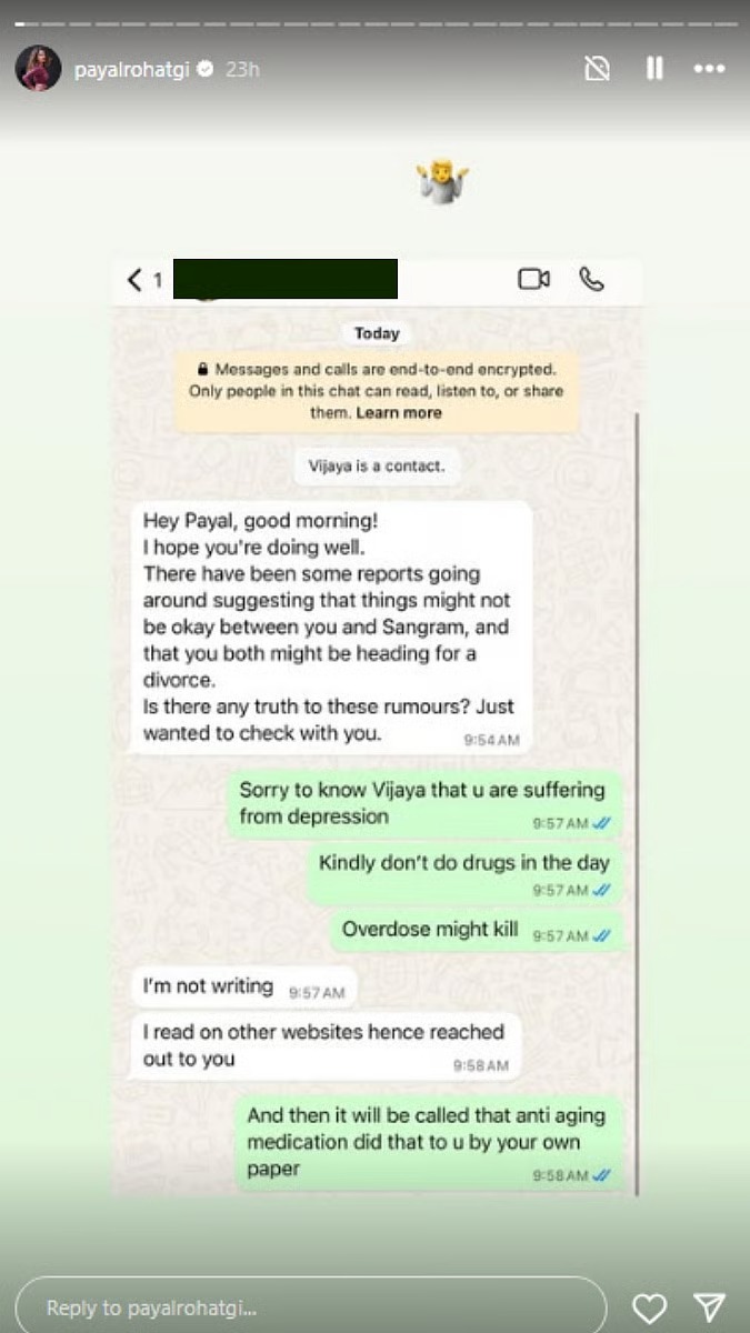 जर्नलिस्ट का यह मैसेज देख पायल नाराज हो जाती हैं और उस पर डिप्रेशन में होने और ड्रग्स लेने का आरोप लगा देती हैं। पायल ने लिखा, 'यह जानकर दुख हुआ कि तुम डिप्रेशन में हो। प्लीज दिन में ड्रग्स मत लिया करो... ओवरडोज से मौत हो सकती है। और फिर तुम्हारा खुद का अखबार कहेगा कि एंटी-एजिंग दवाइयों से ऐसा हो गया।'