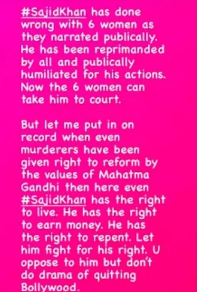 पालय ने इंस्टाग्राम पर लंबा चौड़ा पोस्ट लिखा है, जिसमें वह कह रही हैं, 'जब से सलमान खान ने साजिद खान को कंटेस्टेंट के तौर पर शो में बुलाया है, तब से साजिद के खिलाफ सोशल मीडिया पर हल्ला मच गया है। कई सारे लोग मेकर्स और चैनल वालों को कॉल कर कह रहे हैं कि शो में उस इंसान को बुलाया गया है, जिसका नाम कभी मी टू (#MeeToo) में आ चुका है। जबकि साजिद पर लगे आरोप अभी तक साबित भी नहीं हुए हैं। करीब चार साल पहले कुछ फीमेल सेलेब्स ने क्लेम किया था कि साजिद ने उनके साथ कई मौकों पर गंदी बात की है, उनके साथ अभद्र व्यवहार किया है। आरोप लगाने वालों में मंदाना करीमी भी शामिल हैं, जिन्होंने कहा था जब वह हमशकल के लिए साजिद से मिलने गईं तो उन्हें कपड़े उतारने को कहा गया था। साजिद ने मंदाना से कहा था कि अगर मुझे वह पसंद आता है, जो मैं देखता हूं, तो मैं तुम्हें कास्ट कर सकता है।'