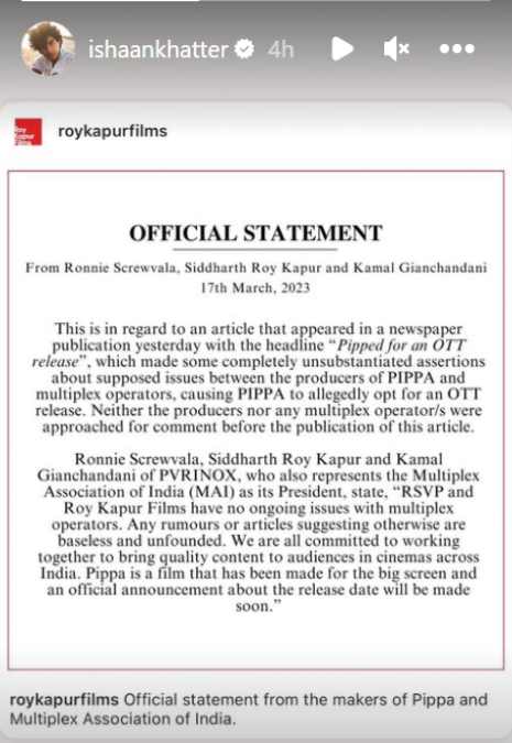 रॉनी स्क्रूवाला, सिद्धार्थ रॉय कपूर और कमल गियानचंदानी की ओर से जारी स्टेटमेंट में कहा गया कि एक अखबार में छपे गये आर्टिकल की वजह से गलत धारणा फैल रही है कि पिप्पा के निर्माताओं और मल्टीप्लेक्स मालिकों के बीच खींचतान के कारण ओटीटी रिलीज का रास्ता देखा जा रहा है। इस आर्टिकल को छापने से पहले ना तो निर्माताओं और ना ही मल्टीप्लेक्स ओनर्स से संपर्क किया गया।