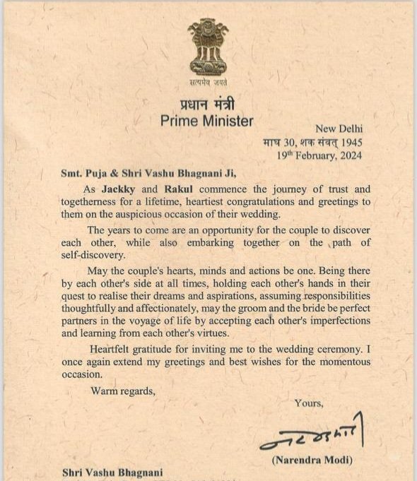 प्रधानमंत्री की तरफ से मिले इस पत्र में रकुल प्रीत और जैकी भगनानी को शादी की मुबारकबाद दी गई हैं। इसके साथ ही उन्होंने इस कपल की जीवन में खुशहाली को लेकर भी अपनी तरफ से दुआ की है और आशीर्वाद दिया है। जैकी ने इस लेटर को ट्वीट में लिखा है-