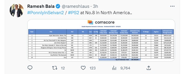 इसके साथ ही उन्होंने टॉप 10 फिल्मों का चार्ट शेयर किया है, जिसमें 'जॉन विक: चैप्टर 4' और 'इविल डेड राइज'सहित कई अन्य बड़ी फिल्में शामिल हैं।