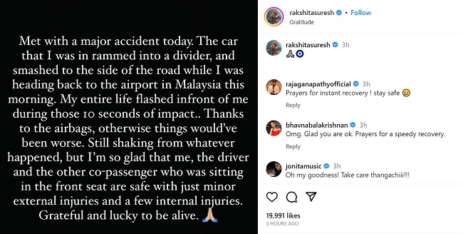 Ponniyin Selvan 2 सिंगर रक्षिता सुरेश का मलेशिया में हुआ बड़ा कार एक्सीडेंट, शेयर कर दी जानकारी