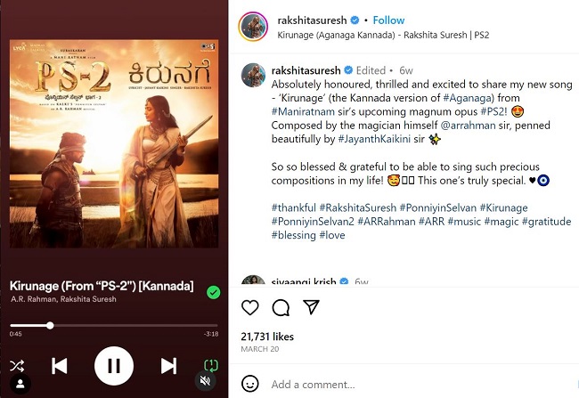रक्षिता सुरेश ने पोन्नीइन सेल्वन 2 में एक गाना गाया है