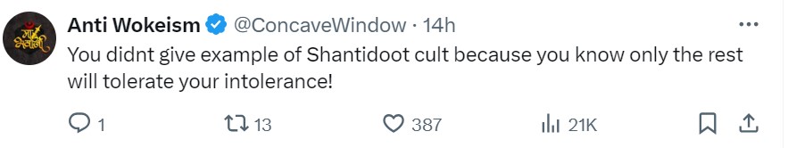 आपने शांतिदूत होने का उदाहरण पेश नहीं किया। क्योंकि आप खुद से अच्छे से जानती हो कि कुछ ही लोग आपकी असहिष्णुता को बर्दाशत करेंगे।
