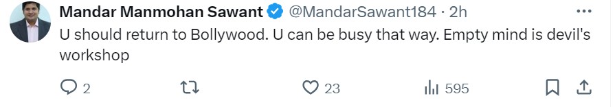 एक अन्य यूजर ने लिखा है- आपको बॉलीवुड में वापस लौट जाना चाहिए, ताकि आप बिजी रह सको। क्योंकि खाली दिमाग शैतान का घर होता है।