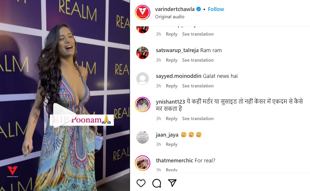 पूनम पांडे की निधन की खबर कुछ पैपराजी पेज ने भी इंस्टाग्राम पर शेयर की। वरिंदर चावला ने अपने पोस्ट में न्यूज को कन्फर्म करते हुए कहा कि पूनम पांडे के मैनेजर ने उनके निधन की खबर की पुष्टि की है। हालांकि, लोगों के लिए उनके मौत की खबर पर यकीन करना मुश्किल हो रहा है।
