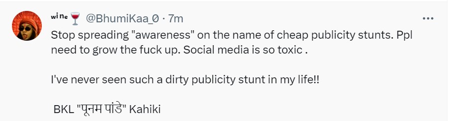 एक एक्स यूजर ने ट्वीट कर लिखा है- कृपया जागरूकता के नाम पर इस तरह के गंदे पब्लिकसिटी स्टंट न करें। ऐसा गंदा मजाक मैंने पूरी लाइफ में नहीं देखा शर्म करो। दूसरे यूजर ने लिखा है- वो स्त्री है कुछ भी कर सकती है।