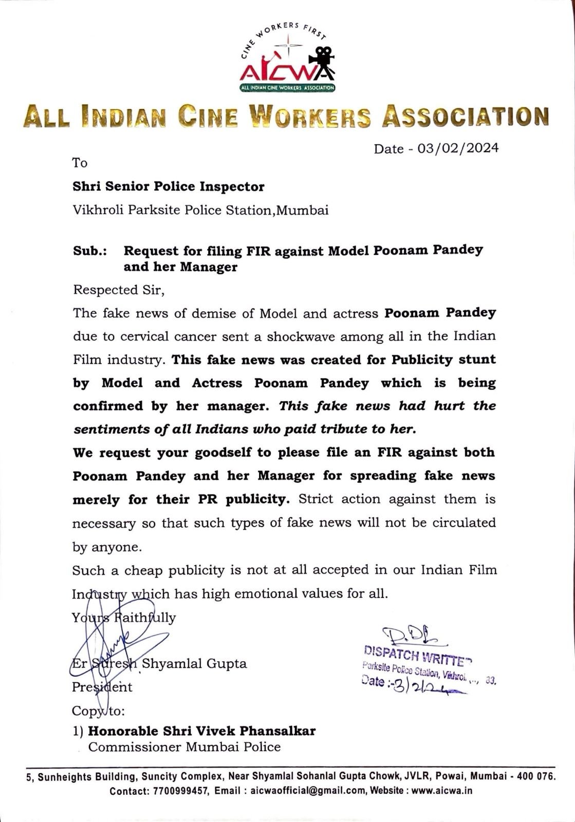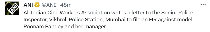 समाचार एजेंसी एएनआई की तरफ से एक लेटेस्ट ट्वीट सामने आया है, जिसमें ये जानकारी दी गई है कि पूनम पांडे के खिलाफ पुलिस शिकायत की मांग की गई है। दरअसल ऑल इंडिया सिने वर्कर एसोशिएसन की तरफ से मुंबई के विक्रोली पुलिस स्टेशन के वरिष्ठ पुलिस अधीक्षक को एक लेटर लिखा गया है।