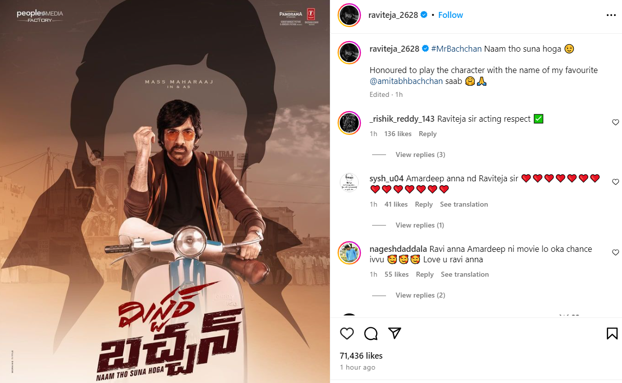 रवि तेजा की इस फिल्म के नाम और पोस्टर से साफ जाहिर हो गया है कि यह अमिताभ बच्चन से इंस्पायर्ड है। इसे शेयर करते हुए एक्टर ने कैप्शन में लिखा, नाम तो सुना होगा..मेरे पसंदीदा अमिताभ बच्चन साहब के नाम वाला किरदार निभाना सम्मान की बात है।