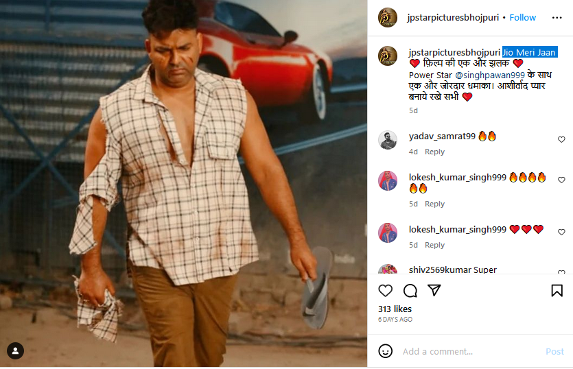 ‘जियो मेरी जान' फिल्म जेपी स्टार पिक्चर्स के बैनर तले बनाया गया। पिछले साल का सुपर डुपर हिट साॅन्ग ‘आ जईहे पांच के, चल जइहे नाच के' की अपार सफलता के बाद अब पवन सिंह और फिल्म प्रोडक्शन हाउस जेपी स्टार पिक्चर्स बैनर की नई भोजपुरी फिल्म ‘जियो मेरी जान' की शूटिंग फुल धमाल मचाने वाली है। इसकी शूटिंग उत्तर प्रदेश के लखनऊ में शुरू हुई है। इसी फिल्म के सेट से पवन का लुक सामने आया है। बता दें कि पागल के लुक में पवन सिंह का यह तस्वीर जेपी स्टार्स भोजपुरी के इंस्टाग्राम अकाउंट पर भी पोस्ट किया गया है।