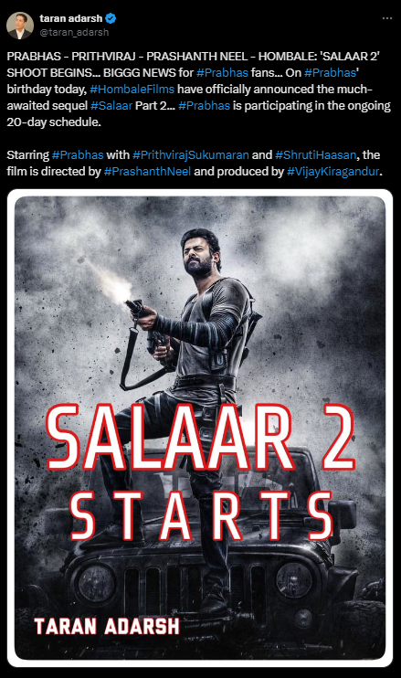 उन्होंने प्रभास का एक पोस्टर शेयर करते हुए लिखा, "प्रभास-पृथ्वीराज और प्रशांत नील की होम्बले प्रोडक्शन में बन रही फिल्म 'सालार-2' की शूटिंग शुरू हो गई है। प्रभास के जन्मदिन पर उनके फैंस के लिए ये एक बड़ी खबर है। होम्बले फिल्म्स ने 'सालार' के सीक्वल की आधिकारिक घोषणा कर दी है। प्रभास टीम के साथ आने वाले दिनों में 20 दिन शूट करेंगे"।