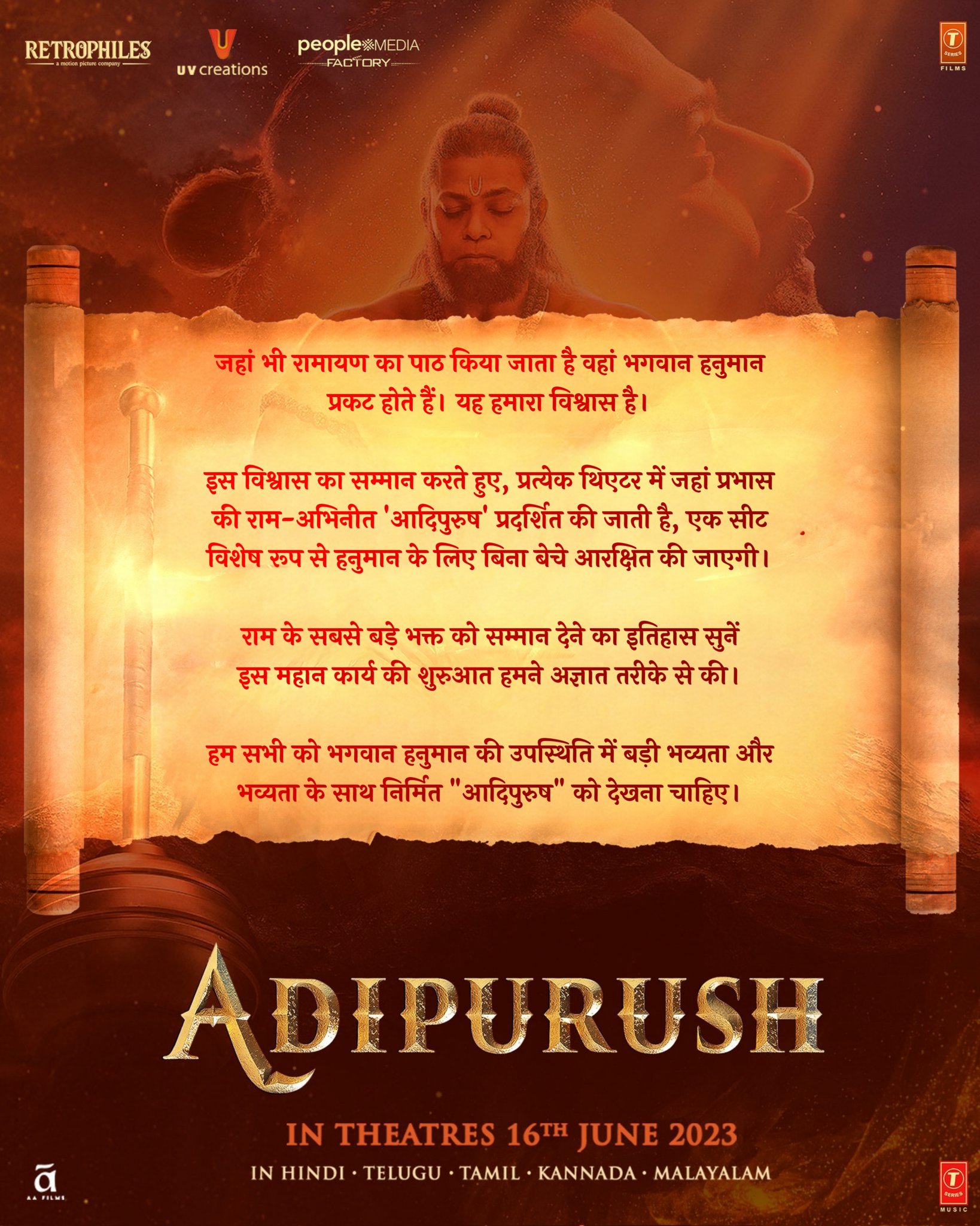 रिपोर्ट के अनुसार, "टीम ने स्टेटमेंट जारी करते हुए कहा, "जहां भी रामायण का पाठ किया जाता है वहां भगवान हनुमान प्रकट होते हैं। यह हमारा विश्वास है। इस विश्वास का सम्मान करते हुए, प्रभास की राम-अभिनीत आदिपुरुष प्रदर्शित की जाती है, एक सीट विशेष रुप से हनुमान के लिए बिना बेचे आरक्षित की जाएगी।"