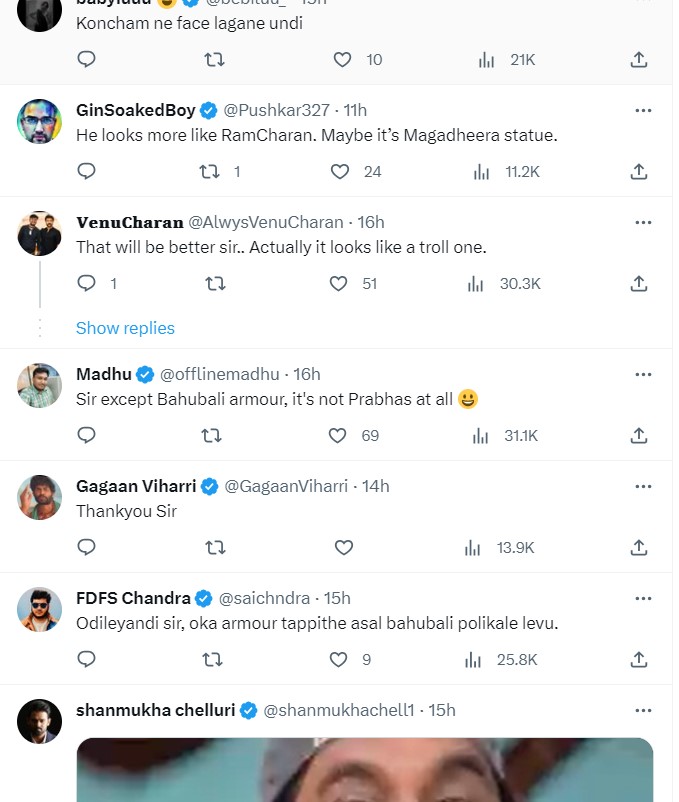 प्रभास का स्टैच्यू उनके किसी फैन को भी पसंद नहीं आया। एक ने लिखा, ''यह राम चरण की तरह लग रहा है। शायद ये मगधीरा से लिया गया स्टैच्यू डिजाइन है।'' एक अन्य यूजर ने लिखा, ''बाहुबली आर्मर के अलावा, यह कहीं से प्रभास का स्टैच्यू नहीं लग रहा।''
