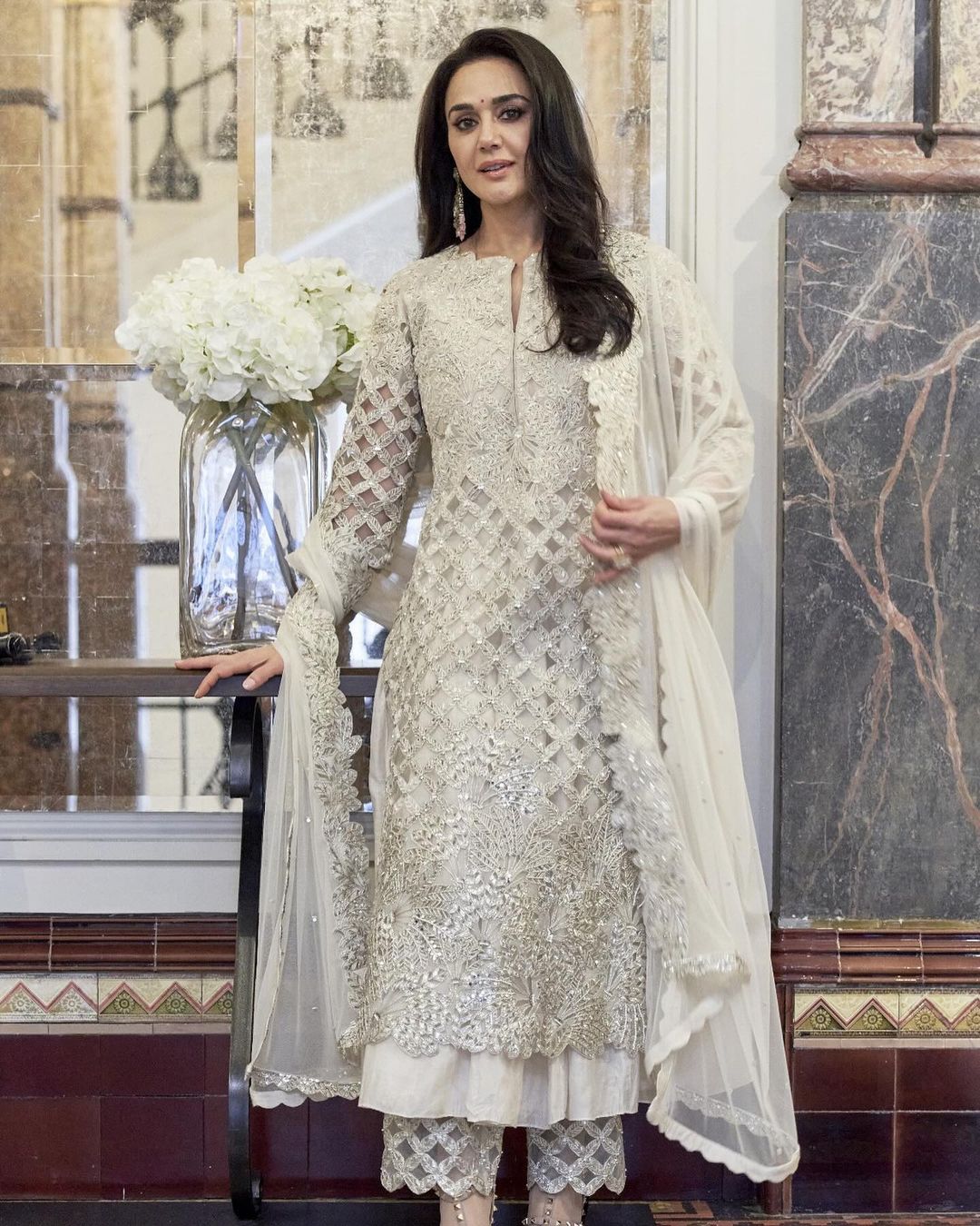 प्रीति जिंटा फिल्मों से भले ही दूर हैं, लेकिन सोशल मीडिया पर सुर्खियों में बनी रहती हैं। इन दिनों अदाकारा अपने देश भारत में ही हैं। अब एक्ट्रेस ने इंस्टाग्राम पर कुछ तस्वीरे शेयर की है, जिसमें वह व्हाइट कलर के चिकिन वाले सूट में नजर आ रही हैं। इस पर एक्ट्रेस मैंचिग इयररिंग्स और मैंचिग हाई हिल्स कैरी की हुई है।