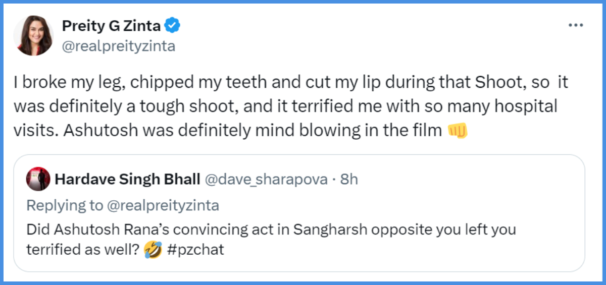 जब एक अन्य फैन ने इस फिल्म में आशुतोष राणा के किरदार के बारे में पूछा कि क्या एक्ट्रेस को उनसे डर लगा था? इस पर प्रीति ने शूटिंग के दिनों को याद करते हुए कहा-