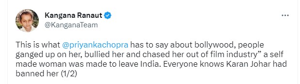 उन्होंने ट्वीट किया था, 'बॉलीवुड के बारे में प्रियंका यही कहना चाहती हैं, लोगों ने उनके खिलाफ गैंग बनाई, उन्हें बुली किया और फिल्म इंडस्ट्री से बाहर का रास्ता दिखाया। खुद से अपने दम पर अपनी पहचान बनाने वाली प्रियंका को इंडिया छोड़ना पड़ना। सभी जानते हैं कि करण जौहर ने उन्हें बैन कर दिया था।'