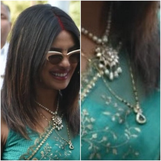 सब्यसाची मुखर्जी की डिज़ाइन की गई साड़ी में बेहद खिलखिला रहीं प्रियंका ने बड़ा ही अलग तरह का डिजाइनर मंगलसूत्र पहन रखा था, जो परम्परागत मंगलसूत्र से थोड़ा डिफरेंट था। उस के साथ डायमंड पेंडेंट भी लगा था।