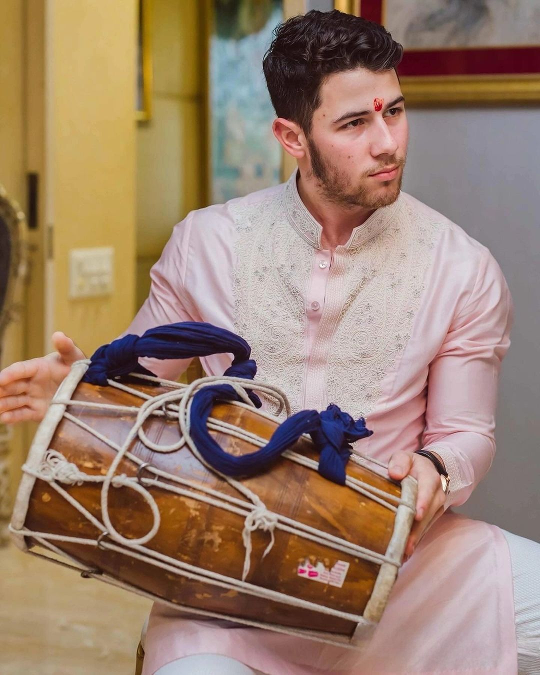 इन खूबसूरत फोटोज के अलावा निक जोनस की एक और फोटो सामने आई है। इस फोटो में पिंक रंग का कुर्ता पहने हुए निक जोनस ने हाथों में ढोल पकड़ा हुआ है।