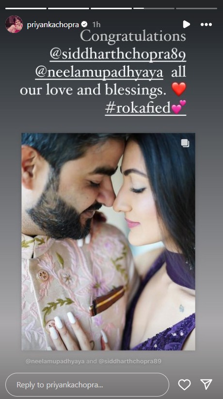प्रियंका चोपड़ा ने अपनी इंस्टा स्टोरी में भाई सिद्धार्थ चोपड़ा और होने वाली भाभी नीलम उपाध्याय की फोटो शेयर की है। साथ ही रोका सेरेमनी की बधाई भी दी। इसके अलावा एक फोटो उन्होंने कपल के साथ अपनी और निक जोनस की भी शेयर की है। नीलम उपाध्याय ने अपने सोशल मीडिया पर पेज पर रोका सेरेमनी का कई फोटो पोस्ट की है। इनमें उनका परिवार साथ देखा जा सकता है।