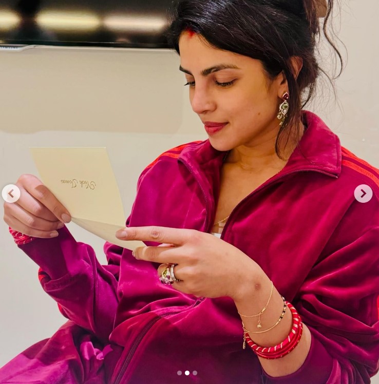 वहीं, दूसरी तस्वीर में वह कुछ पढ़ते हुए देखी जा सकती हैं, जिस पर निक जोनस का नाम लिखा है।