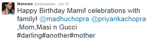 वहीं उनकी कजिन मन्नारा ने इस सेलिब्रेशन की तस्वीरें पोस्ट की। प्रियंका चोपड़ा की मां मधु चोपड़ा उनकी मामी लगेंगी। उन्होंने भी तस्वीरों के साथ अपनी इस मामी को बर्थडे की बधाइयां दीं।
