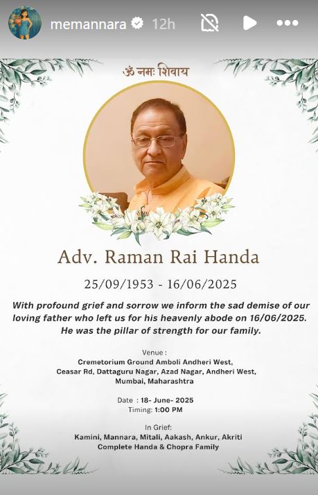 मनारा चोपड़ा ने बीते दिन एक पोस्ट के जरिए बताया कि उनके पिता रमन राय हांडा (Raman Rai Handa) का निधन हो गया है। उन्होंने एक पोस्ट में लिखा, "बहुत दुख और पीड़ा के साथ हम अपने प्यारे पिता के दुखद निधन की सूचना देते हैं, जो 16/06/2025 को हमें छोड़कर चले गए। वह हमारे परिवार के लिए शक्ति और मजबूत स्तंभ थे।"