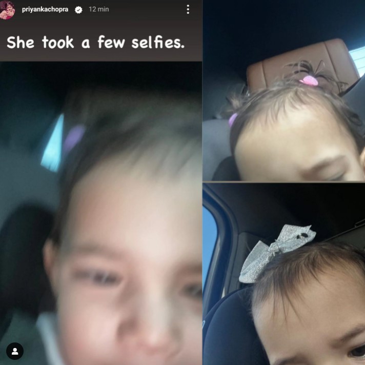 प्रियंका चोपड़ा की इंस्टा स्टोरी के इस स्क्रीन शॉट को उनके एक फैन क्लब ने शेयर किया है। ये सभी सेल्फी मालती ने कार में ली हैं। पहली फोटो में जहां मालती का चेहरा ब्लर है, तो वहीं दूसरी फोटो में सिर्फ नन्हीं मालती की दो चोटी दिखाई दे रही है।
