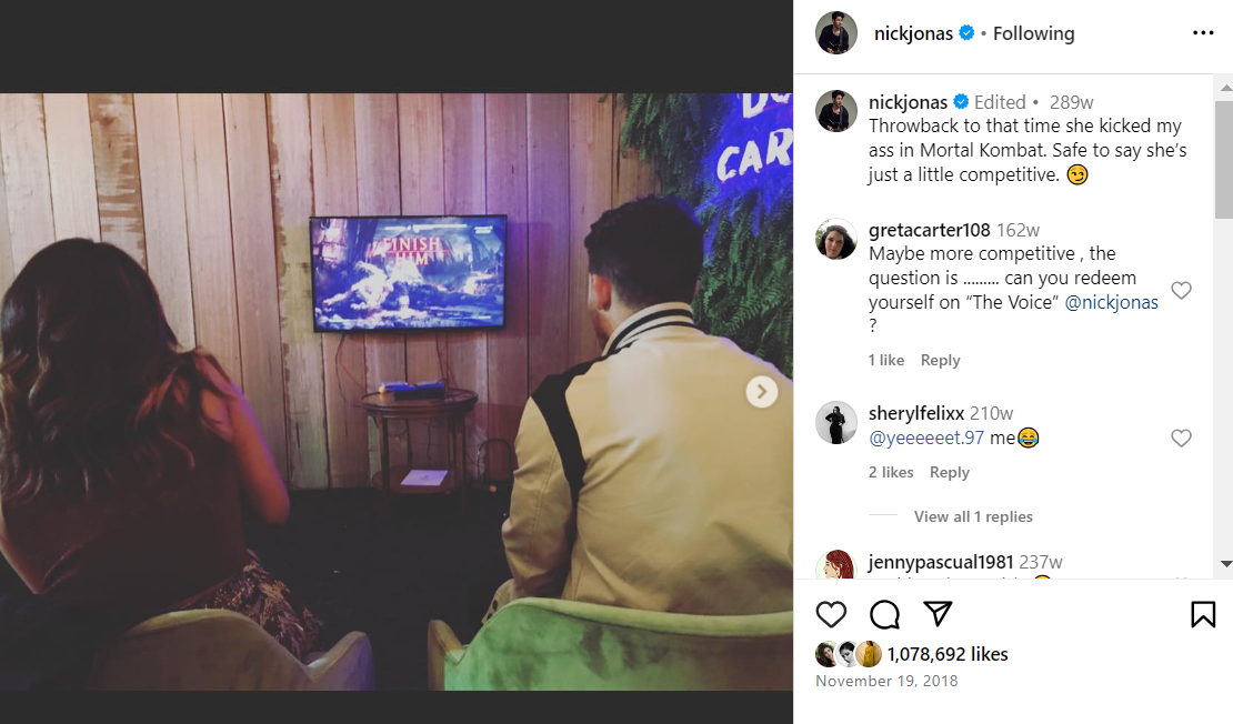 शादी से पहले निक जोनस और प्रियंका चोपड़ा ने काफी समय तक डेटिंग की थी और साल 2018 में सात फेरे लिए। शादी के बाद पीसी अमेरिका शिफ्ट हो चुकी है। देसी गर्ल ने शादी से पहले निक जोनस के साथ एक गेम खेला था, जिसका नाम था 'मॉर्टल कोम्बैट' (Mortal Kombat), जिसमें पीसी ने उन्हें हरा दिया था। इस हार के बाद निक ने इंस्टाग्राम पर फोटोज भी शेयर की थी और लिखा था, "उस समय की याद, जब उसने मॉर्टल कोम्बैट में मुझे हराया था। यह कहना सुरक्षित है कि वह थोड़ी प्रतिस्पर्धी है।"