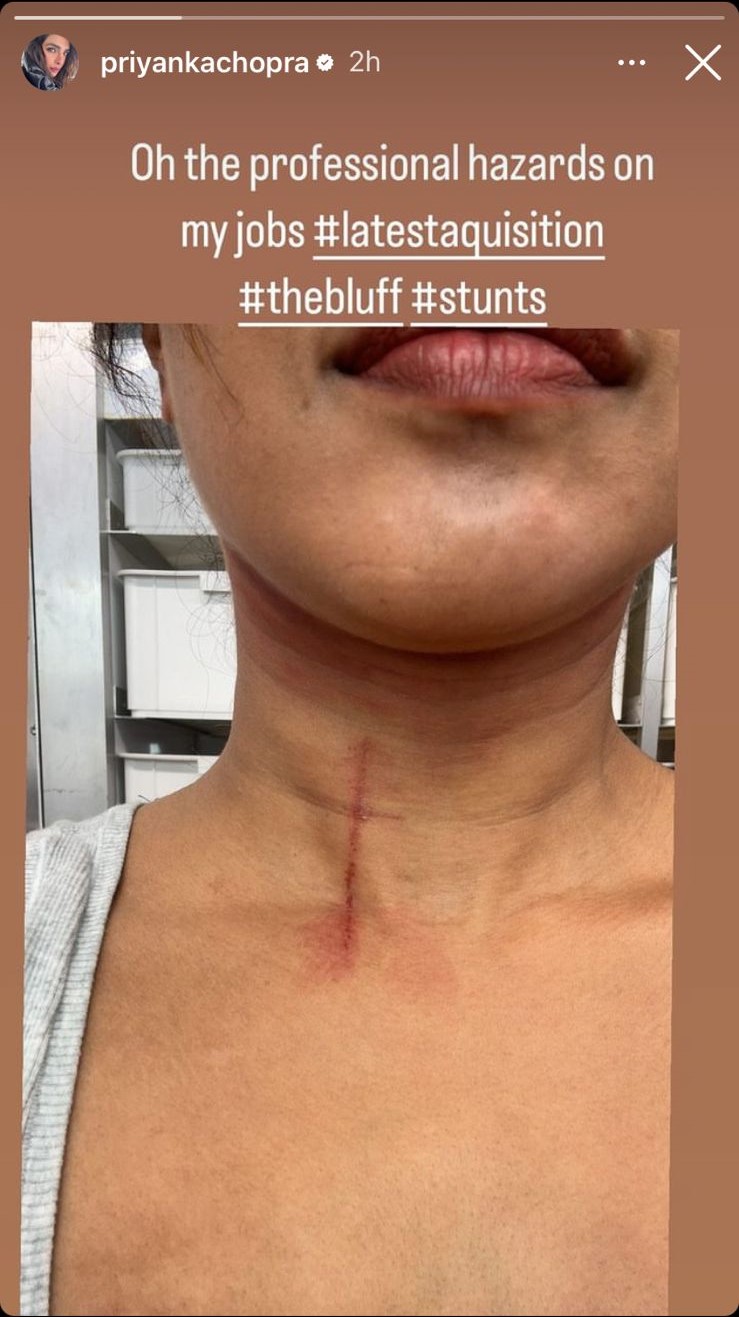 दरअसल प्रिंयका चोपड़ा ने अपने ऑफिशियल इंस्टाग्राम हैंडल पर स्टोरी में एक लेटेस्ट तस्वीर को शेयर किया है। इस फोटो में आप देख सकते हैं कि उनकी गर्दन पर चोट का लाल निशान साफ दिखाई दे रहा है। इसके कैप्शन में उन्होंने लिखा है- और ये मेरे पेशेवर काम का एक बड़ा जोखिम।
