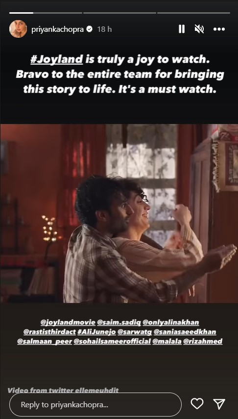 प्रियंका ने अब जॉयलैंड की प्रशंसा की है। एक्ट्रेस ने अपने इंस्टाग्राम के स्टोरी सेक्शन में फिल्म का छोटा-सा क्लिप शेयर किया। जॉयलैंड की तारीफ करते हुए प्रियंका ने कैप्शन में लिखा, "जॉयलैंड देखकर मजा आ गया। इस कहानी को बताने के लिए पूरी टीम को शाबाशी देती हूं। फिल्म को जरूर देखें। इसके साथ ही एक्ट्रेस ने फिल्म की टीम को भी टैग किया।"