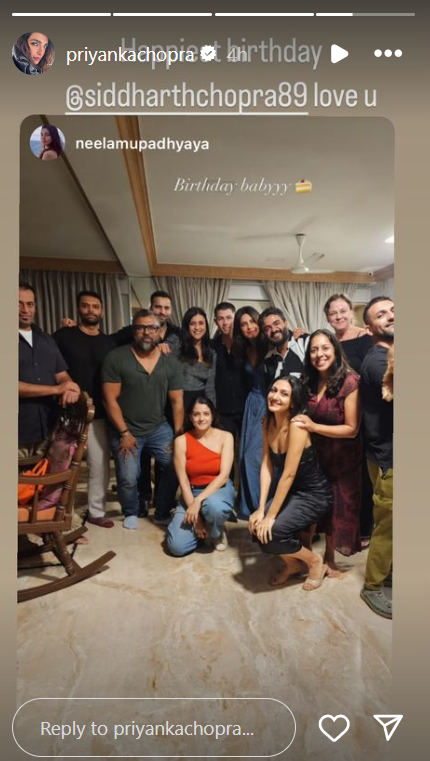 ये फोटो सिद्धार्थ चोपड़ा के बर्थडे की है। इस फोटो को शेयर करते हुए प्रियंका ने कैप्शन में लिखा, "हैप्पी बर्थडे सिद्धार्थ चोपड़ा, लव यू"।