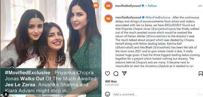 Jee Le Zaraa Priyanka Chopra Out एक्ट्रेस प्रियंका चोपड़ा आलिया भट्ट और कटरीना कैफ की फिल्म जी ले जरा से एक्ट्रेस प्रियंका चोपड़ा ने बाहर होने का निर्णय लिया है। हालांकि अभी तक एक्ट्रेस या फिल्म प्रोडक्शन कंपनी की ओर से कोई आधिकारिक बयान नहीं आया है लेकिन एक वेरिफाइड इंस्टाग्राम अकाउंट ने इस बात की पुष्टि कर दी है।