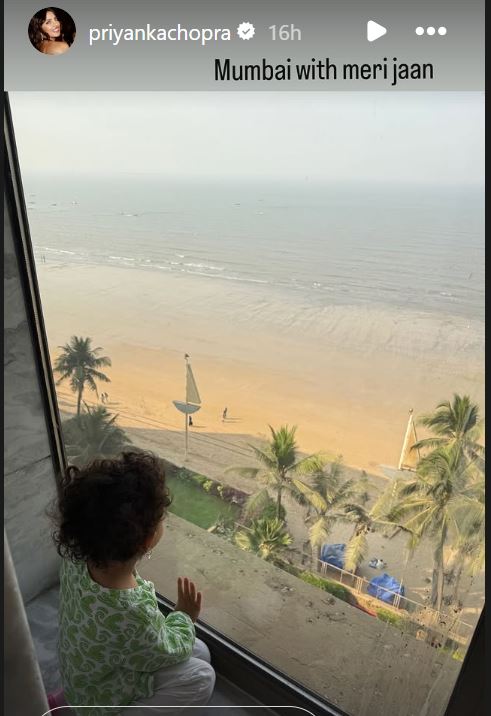 प्रियंका चोपड़ा ने इंस्टाग्राम स्टोरी पर अपनी बेटी मालती की एक तस्वीर भी शेयर की है। इसमें उनकी लाडली मालती शीशे से समंदर के नजारे का आनंद लेती हुई दिखाई दे रही हैं। इस फोटो के साथ एक्ट्रेस ने कैप्शन में लिखा, "मेरी जान के साथ मुंबई।"