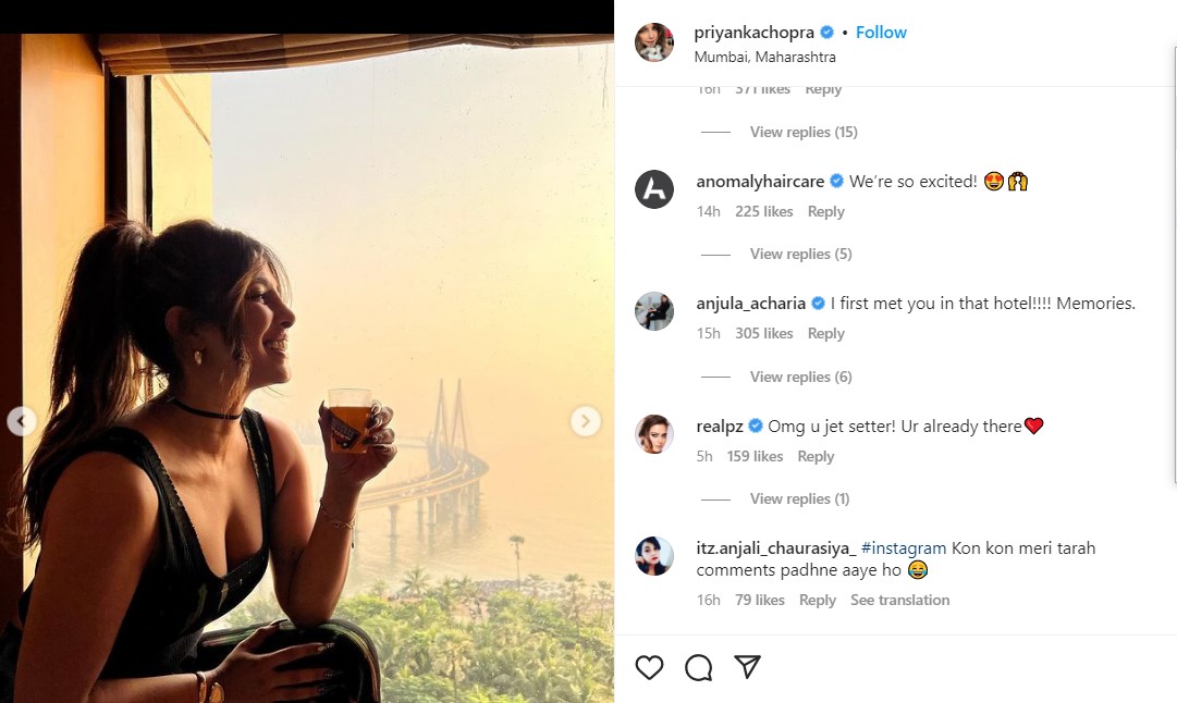 उनकी तस्वीर पर दिया मिर्जा ने कमेंट किया, 'कल्पना कीजिए। यह होटल हम दोनों के लिए एक हफ्ते तक घर था। वेलकम बैक।' इस पोस्ट पर रिप्लाई में बिपाशा बसु और सोनाली बेंद्रे ने कमेंट सेक्शन में हार्ट वाली इमोजी जोड़ कर उनके वापस आने पर खुशी जाहिर की है। जानकारी के लिए बता दें कि मां बनने के बाद यह प्रियंका की पहली भारत यात्रा है।