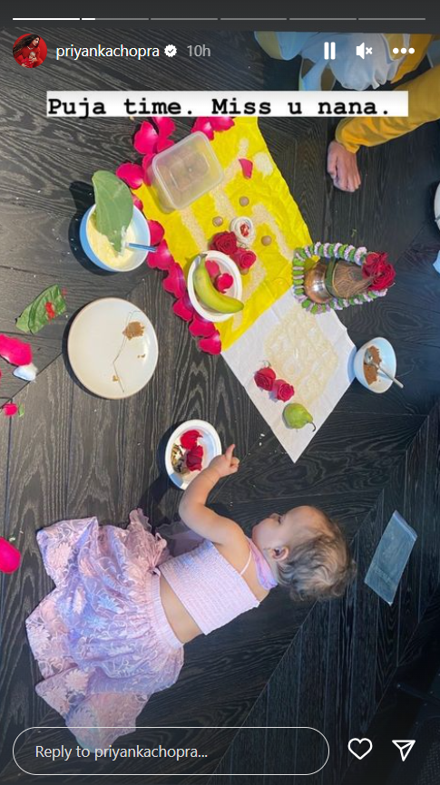 शेयर की गई तस्वीरों को देखकर लग रहा है कि प्रियंका ने अपने पिता की पुण्यतिथि पर घर पर विशेष पूजा रखी थी। यह दूसरा मौका है जब प्रियंका ने अपनी बेटी मालती मैरी को लहंगा पहना है। तस्वीर में मालती पूजा के बाद फर्श से फूल उठाती नजर आ रही हैं। प्रियंका ने अपने पोस्ट के साथ लिखा, "पूजा टाइम, मिस यू नाना।"