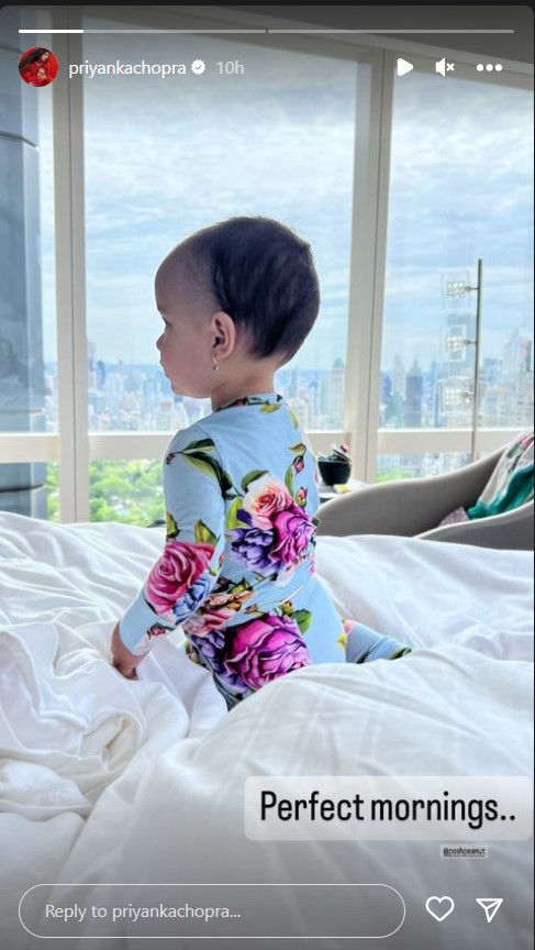 प्रियंका ने अपनी खूबसूरत बेटी के साइड फेस की फोटो फैंस के साथ शेयर की है। तस्वीर में देखा जा सकता है कि मालती बेड पर है, और खिड़की की तरफ देख रही है। विंडो से शहर का खूबसूरत नजारा दिखाई दे रहा है। इस फोटो को शेयर करते हुए प्रियंका ने कैप्शन में लिखा, 'परफेक्ट मॉर्निंग।' खास बात यह है कि मालती इस फोटों में ईयररिंग पहने नजर आ रही हैं।