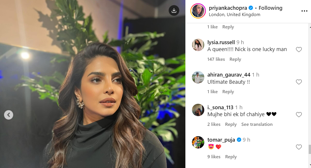 प्रियंका की ये तस्वीरें लंदन में एक इवेंट के दौरान की हैं। आखिरी दो तस्वीरों में प्रियंका एक फिटेड ब्लैक फुल-स्लीव टॉप पहने हुए कैमरे के लिए पोज देती नजर आईं। कैप्शन में प्रियंका ने लिखा, "जब ग्लैमर बस इतना अच्छा हो।"