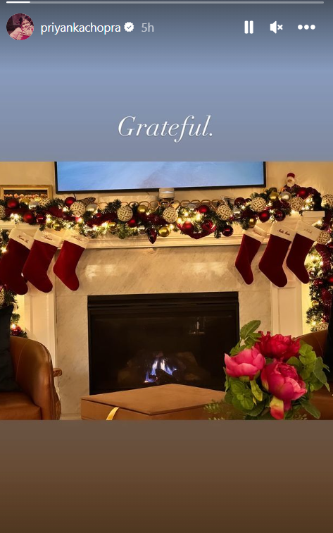 प्रियंका चोपड़ा ने अपनी इंस्टाग्राम स्टोरी पर एक फोटो शेयर की है, जिसमें देखा जा सकता है कि पीसी के फायरप्लेस कॉर्नर को लाइट्स, बाउबल्स, होली और आइवी से डेकोरेट किया गया है। इतना ही नहीं सांता के रेड कलर के सॉक्स और फ्लावर पॉट भी नजर आ रहा है। फोटो शेयर करते हुए प्रियंका ने कैप्शन में लिखी, "ग्रेटफुल"।