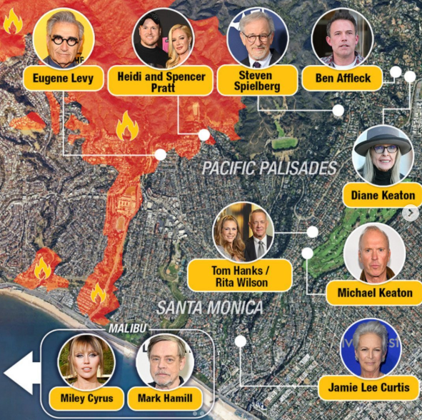 लॉस एंजेलिस के जंगल में लगी आग धीरे-धीरे अब फैल रही है। पेज सिक्स ने अपने आधिकारिक इंस्टाग्राम अकाउंट पर एक मैप शेयर किया है, जिससे ये साफ पता चल रहा है कि तेज हवा के कारण आग अब आसपास के इलाके में फैल रही है। अमेरिकन अभिनेता और टॉम हैंक्स को भी अपना घर खाली करना पड़ा है।