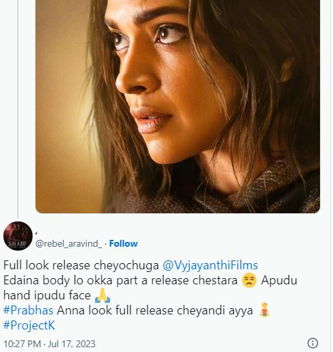 दूसरे यूजर ने लिखा, "मैं तो पूरे लुक की उम्मीद कर रहा था"। अन्य यूजर ने लिखा, "वैजयंती फिल्म्स आपको पूरा लुक रिलीज करना चाहिए था। आपने बॉडी का एक पार्ट रिलीज किया है। हमें प्रभास अन्ना का पूरा लुक चाहिए"।