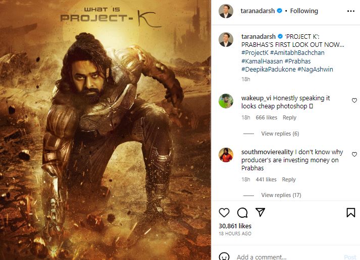 इसके अलावा दूसरे यूजर ने पोस्टर पर कमेंट करते हुए लिखा, "सच कहूं तो ये बहुत ही चीप फोटोशॉप लग रही है"। अन्य यूजर ने लिखा, "मुझे समझ नहीं आ रहा लगातार फ्लॉप के बाद भी प्रोड्यूसर्स प्रभास पर अपनी मनी क्यों इन्वेस्ट कर रहे हैं।
