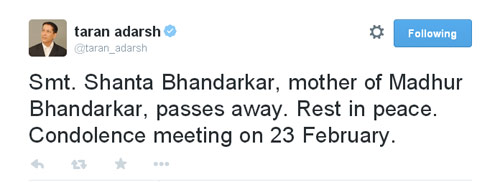 व्यापार विश्लेषक तरण आदर्श ने भी ट्विटर पर इसकी जानकारी दी। उन्होंने ट्वीट किया, 'मधुर भंडारकर की मां श्रीमति शांता भंडारकर का निधन हो गया है। रेस्ट इन पीस। शोक सभा 23 फरवरी को होगी।'