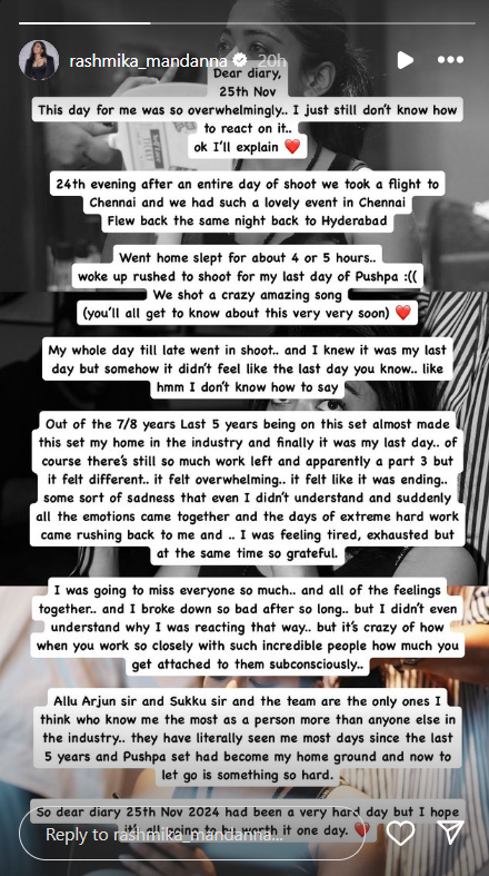 फिल्म की शूटिंग खत्म होने के बाद एक्ट्रेस रश्मिका मंदाना ने अपने आधिकारिक इंस्टाग्राम अकाउंट पर एक स्टोरी पोस्ट की।जिसमें उन्होंने लिखा, "डियर डायरी, 25 नवंबर, ये दिन मेरे लिए भावनाओं से भरपूर रहा है। मुझे नहीं पता मैं कैसे रिएक्ट करूं..ओके मैं एक्सप्लेन करती हूं। 24 तारीख को पूरे दिन शूट करने के बाद हमने चेन्नई की फ्लाइट ली। वहां पर हमारा बहुत ही खूबसूरत इवेंट हुआ, लेकिन उसी रात हम हैदराबाद लौट आए। मैं घर पहुंचकर 4 से 5 घंटे सोई, उसके बाद उठी और जल्दी-जल्दी पुष्पा 2 की शूटिंग के लिए निकली। हमने एक गाना शूट किया,मेरा पूरा दिन शूटिंग में चला गया"।