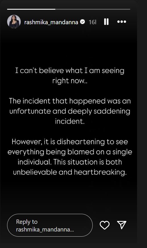 रश्मिका मंदना ने अपने इंस्टाग्राम पर स्टोरी शेयर करते हुए लिखा, मुझे यकीन नहीं हो रहा ये मैं क्या देख रही हूं। जो हादसा हुआ वो बहुत दुर्भाग्यपूर्ण और दुख पहुंचाने वाला था। हालांकि ये देखना भी दुख की बात है कि एक ही शख्स पर इसका सारा इल्जाम मढ़ा जा रहा है।