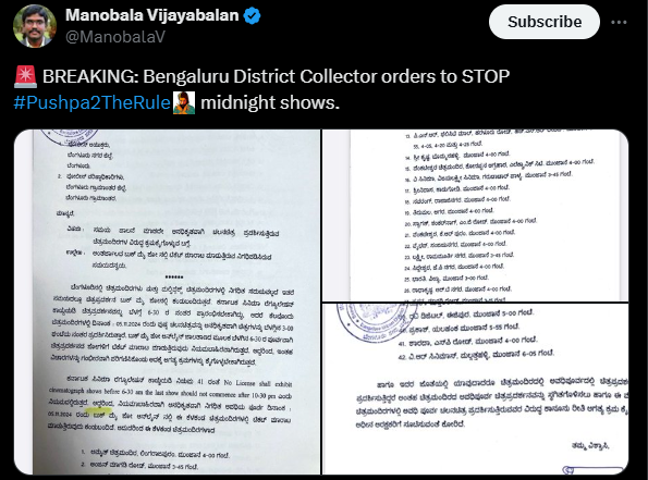 साउथ के फेमस ट्रेड एनालिस्ट मनोबल विजयबालन ने अपने आधिकारिक एक्स अकाउंट पर बेंगलुरु में 'पुष्पा-2' के रात के शोज के कैंसिल होने की जानकारी शेयर की। उन्होंने बताया कि बेंगलुरु जिला प्रशासन ने ये फैसला कन्नड़ फिल्म प्रोड्यूसर एसोसिएशन की उनके खिलाफ दायर की गई याचिका के बाद लिया है। एसोसिएशन का कहना है कि ये कन्नड़ सिनेमा की हमेशा से परंपरा रही है कि कोई भी फिल्म सुबह 6 बजे से पहले रिलीज नहीं की जाए। पुष्पा 2 के लिए इस परंपरा को नहीं तोड़ा जाए।