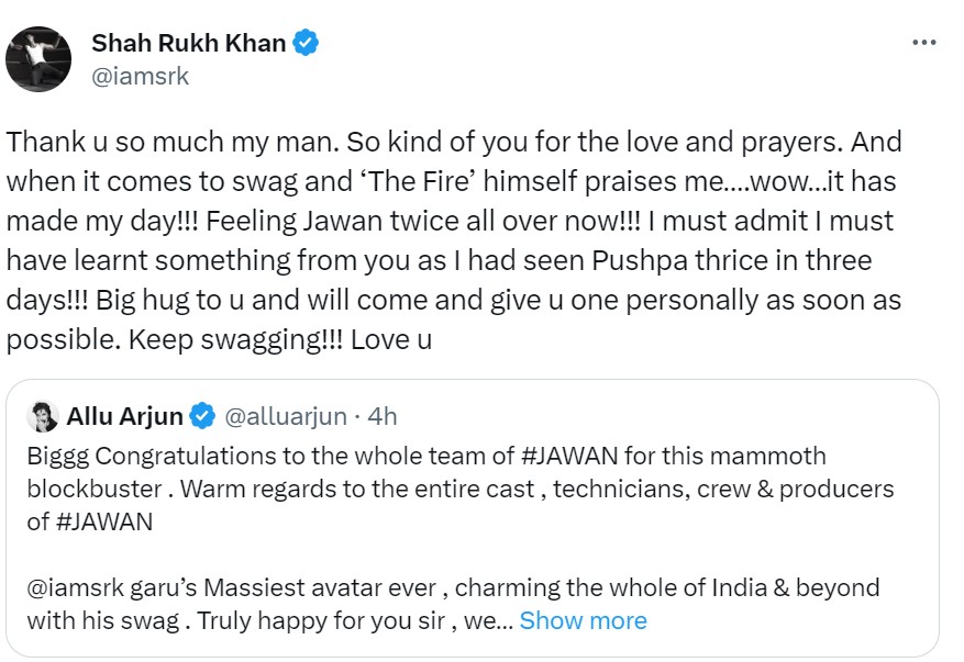 इस कड़ी में अब अगला नाम 'पुष्पा-2' कलाकार अल्लू अर्जुन का नाम जुड़ रहा है, जिन्होंने 'जवान' की प्रशंसा की है। इसके बाद शाह रुख खान ने भी स्टाइल में अल्लू का आभार व्यक्त किया है।