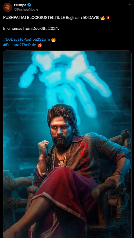 इस पोस्टर को शेयर करते हुए उन्होंने कैप्शन में लिखा, "पुष्पाराज ब्लॉकबस्टर रूल 50 दिनों में आ रही है। बीते दिनों ही ऐसी खबर सामने आई थी कि मेकर्स ने फिल्म के क्रेज को देखते हुए इसे छह तारीख की बजाय पांच दिसंबर को रिलीज करने का फैसला किया है। फिल्म का 4 दिसंबर को ग्रैंड प्रीमियर हो सकता है।