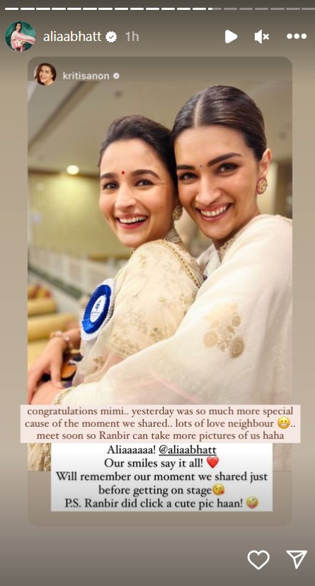 आलिया भट्ट ने कृति सेनन के साथ फोटो शेयर कर उन्हें बधाई दी। उन्होंने लिखा, 'कॉन्गरैचुलेशन्स मिमी...कल हम लोगों ने जो मोमेंट बिताया उससे हमारा दिन बहुत स्पेशल था। आपको बहुत सारा प्यार। मुझसे जल्दी मिलो ताकी रणबीर हमारी बहुत सी फोटो क्लिक करा सके।'