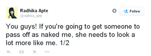 इसकी खबर मिलने के बाद राधिका ने ट्वीट करके कहा कि वो तस्वीरें उनकी नहीं हैं। उन्होंने ट्वीट किया, 'अगर आप लोगों को कोई मेरी न्यूड तस्वीरें भेजता है, तो उस तस्वीर में दिखने वाली लड़की को मेरी तरह और ज्यादा दिखने की जरूरत है।'